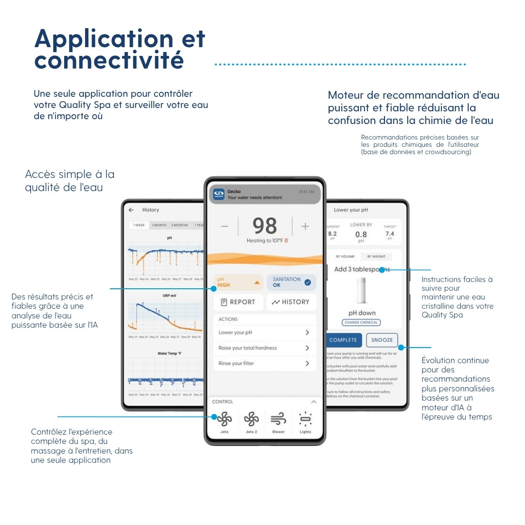 Fini les calculs dignes d’un chimiste ou les doutes sur la couleur d’une bandelette ! Grâce au Gecko Waterlab, vous savez précisément et à tout moment si votre eau est propre, équilibrée et sans danger. Imaginez un assistant personnel qui surveille la qualité de votre spa 24/7, vous alerte au moindre écart et vous indique exactement quoi faire. C’est plus qu’un capteur, c’est votre coach bien-être connecté.