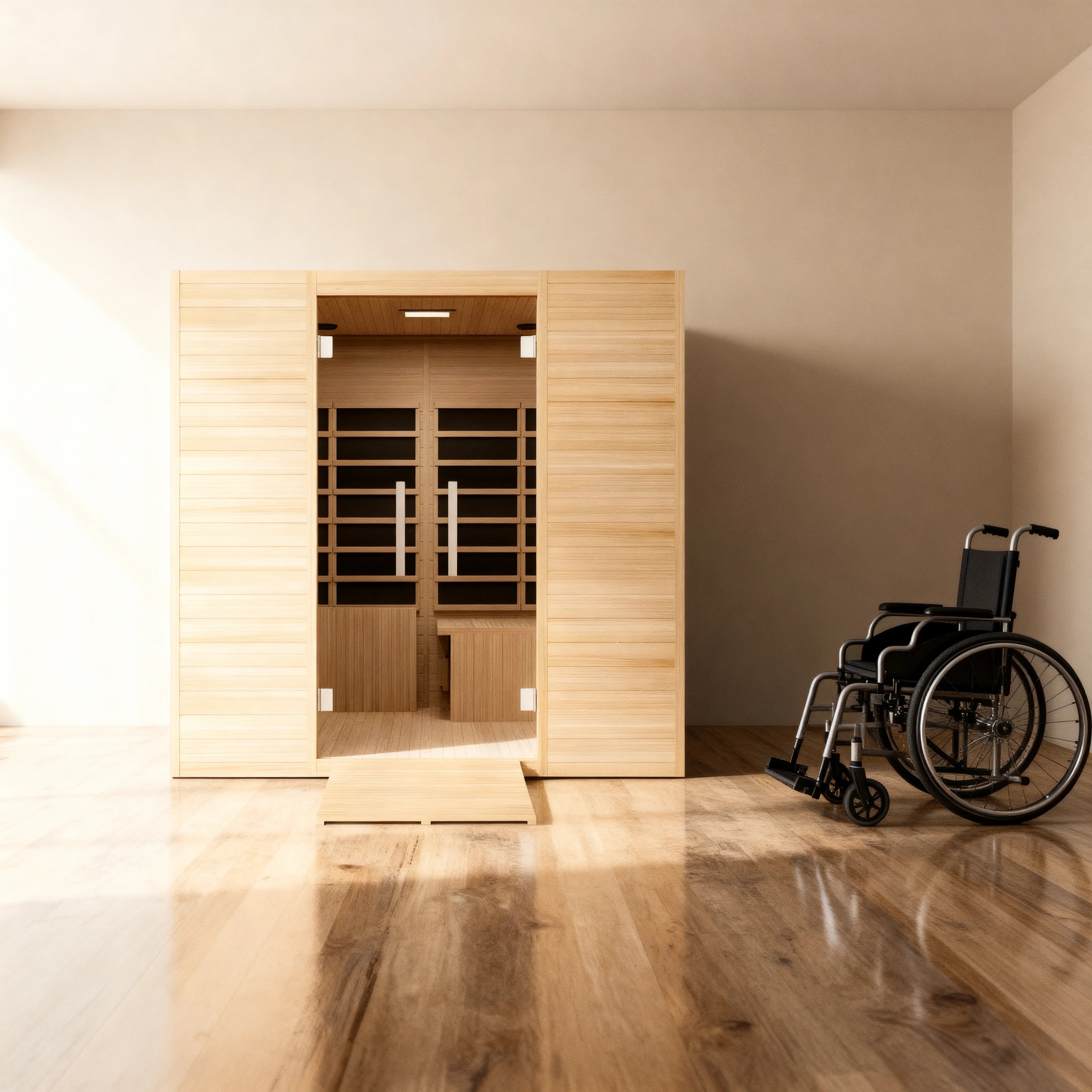 Le Hemma est un sauna infrarouge domestique intérieur accessible PMR (personnes à mobilité réduite) conçu pour une utilisation assise ou en fauteuil roulant.