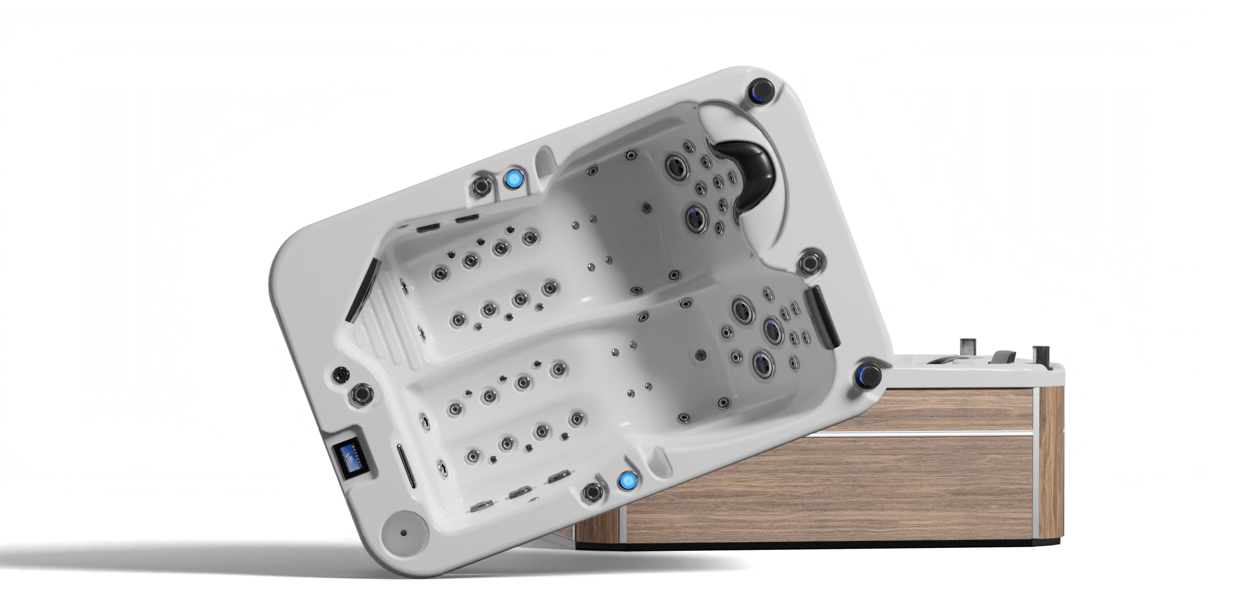 Les finitions en acier chromé des buses et les poignées ergonomiques pour sortir renforcent son allure luxueuse. Confort ultime : appui-tête ajustable, leds chromothérapie, seau à champagne intégré, cascade lumineuse LED et aromathérapie.