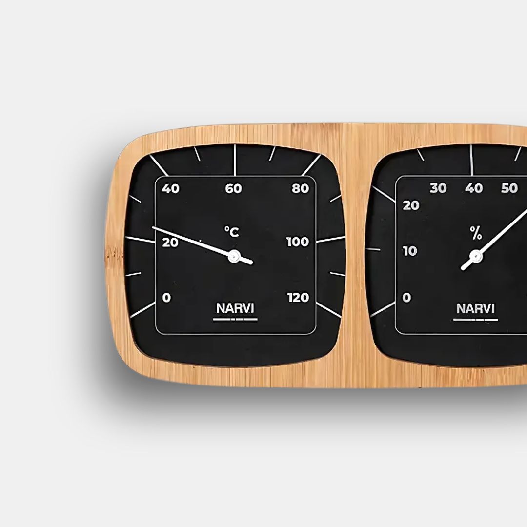 Découvrez le thermomètre-hygromètre Narvi Black pour sauna, alliant précision et design élégant. Fabriqué en aluminium noir et bambou thermo-traité, il mesure efficacement la température et l’humidité de votre sauna, de 0 à 120°C et de 0 à 100%, s’intégrant parfaitement dans tout sauna.